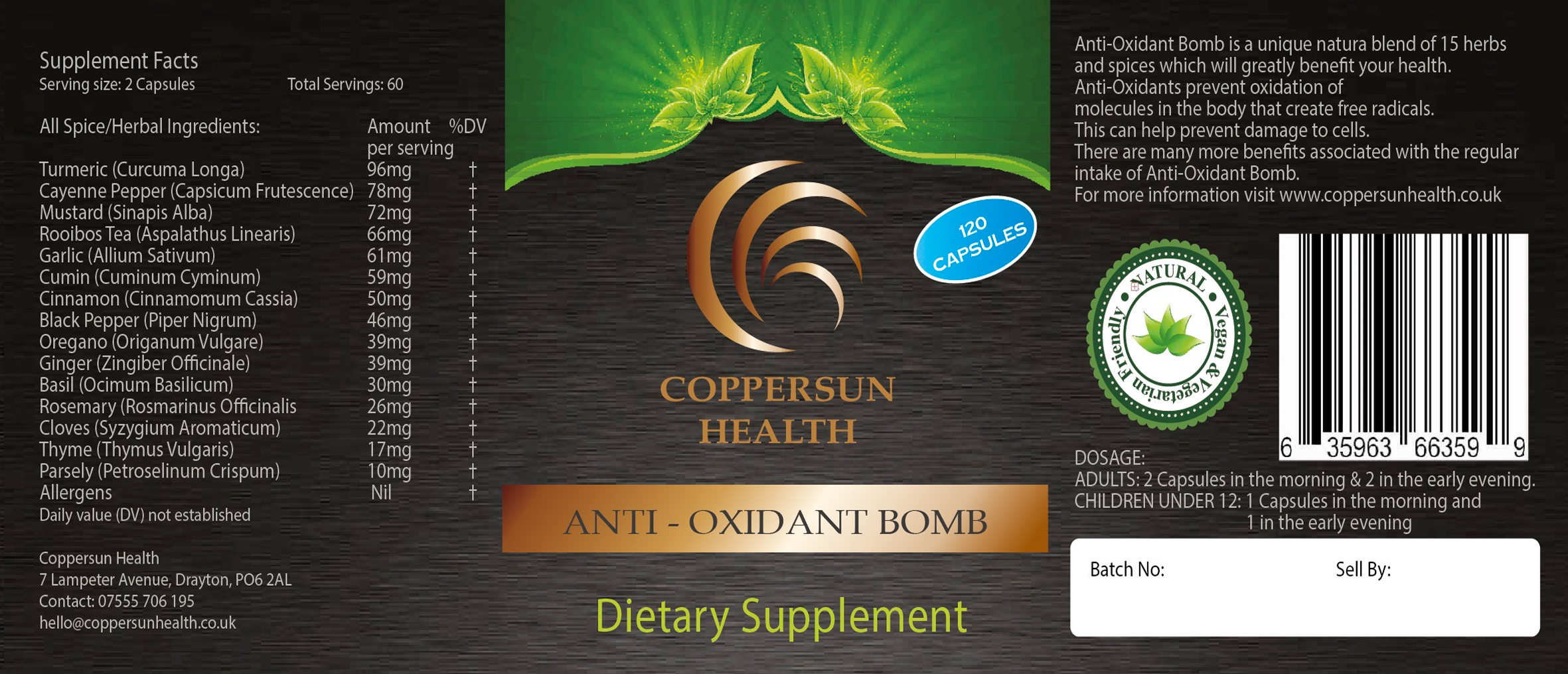 Order now to experience the amazing healthy benefits of Coppersun Health’s Anti-Oxidant Bomb. The Anti-Oxidant Bomb has been uniquely formulated using a powerful blend of 15 herbs and spices.